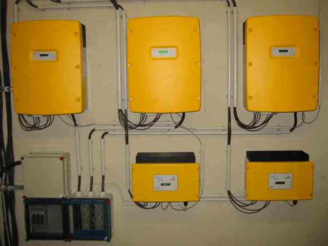 Die Wechselrichter wandeln den Gleichstrom der Solarmodule in Wechselstrom um. Fabr.: SMA 3 Stück SMC 8000 TL 2 Stück Sunny Boy 3000 |